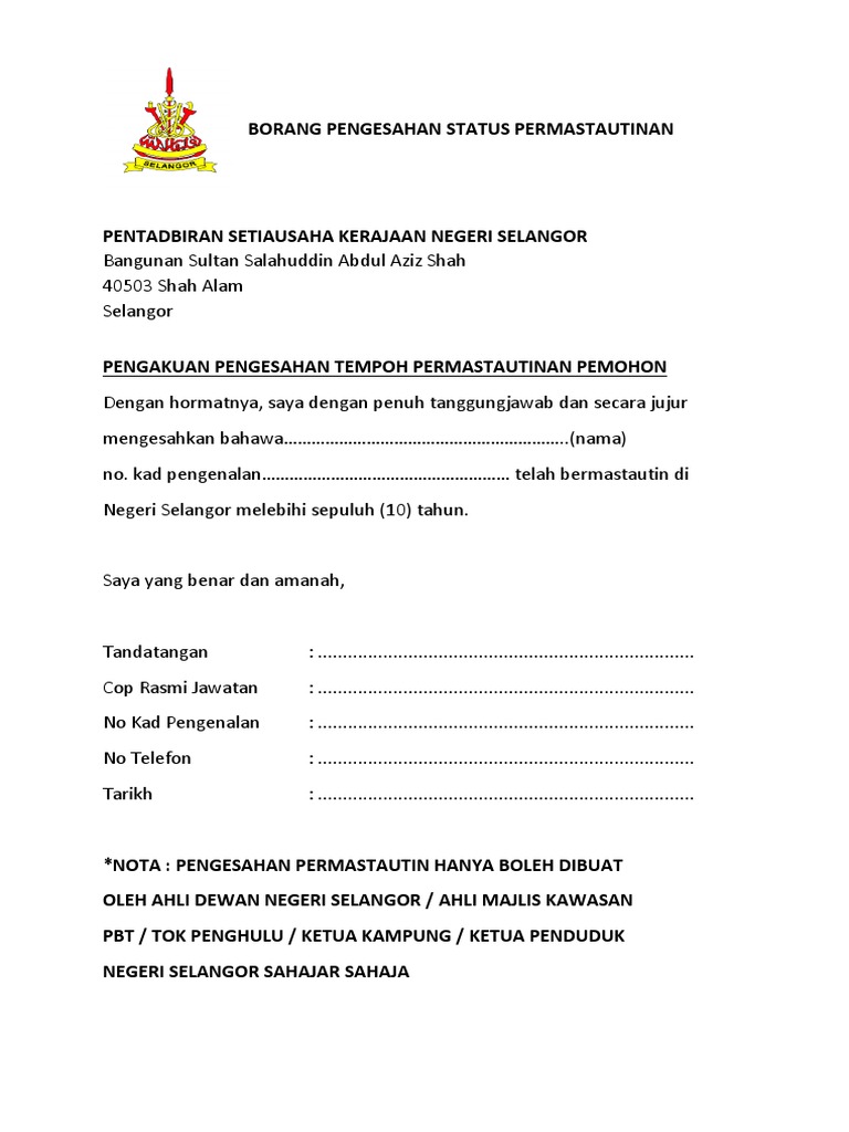 Borang pengesahan status permastautinan pentadbiran setiausaha kerajaan negeri selangor bangunan sultan salahuddin abdul aziz shah 40503 shah alam selangor pengakuan.